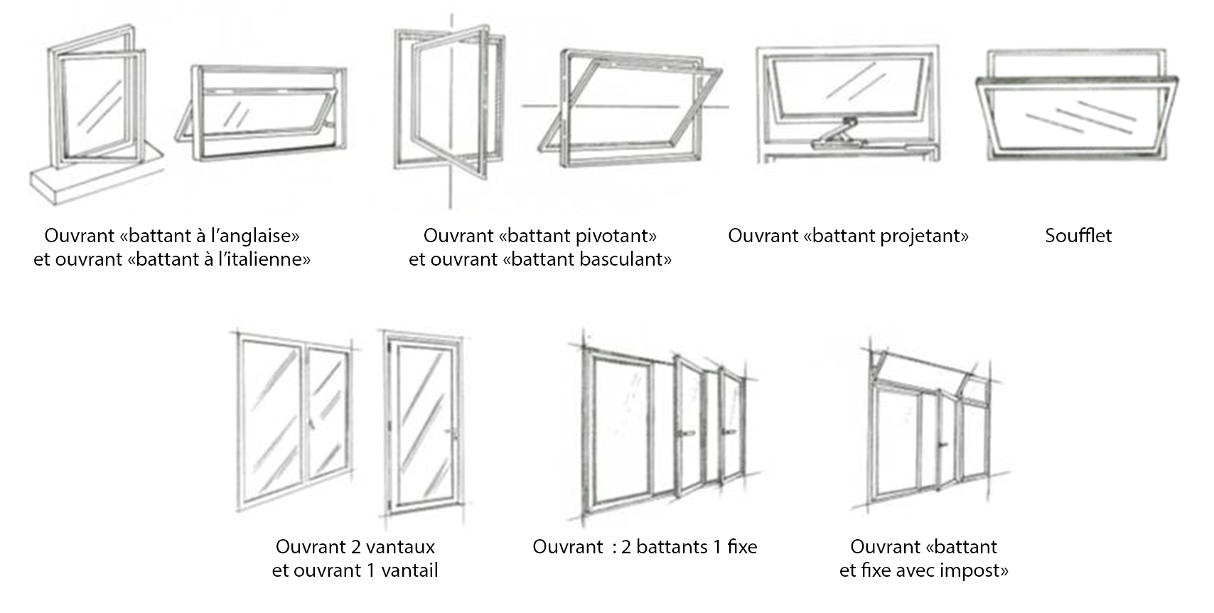 L’ouverture oscillo-battante est plus spécifique. Son axe d’inclinaison peut à la fois être horizontal (ouverture à soufflet) et vertical (ouverture à la française) grâce à sa ferrure spécifique.
